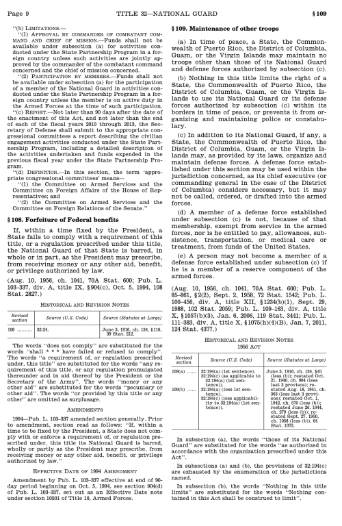 This page serves as a centralized reference for federal statutes, laws, and official directives that govern or affect State Defense Forces. It provides lawmakers, government officials, and military departments with authoritative source documents that define federal authorities, limitations, and relationships at the state level. The materials presented here are intended to support informed policy development, legislative review, and institutional understanding of State Defense Forces within the federal framework.