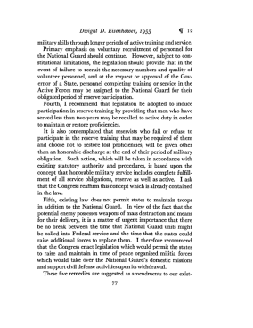President Dwight D. Eisenhower’s 1955 special message argued that U.S. national security demands armed forces maintained in a state of readiness, backed by a trained reserve pool. He urged Congress to enact legislation strengthening the State Defense Forces, emphasizing that active forces alone were insufficient to meet the threat of sudden global conflict. He also contended that states should be able to maintain troops in addition to the National Guard to prevent any gap in defense when Guard units are federalized, thereby ensuring continuity of homeland security and defense obligations.